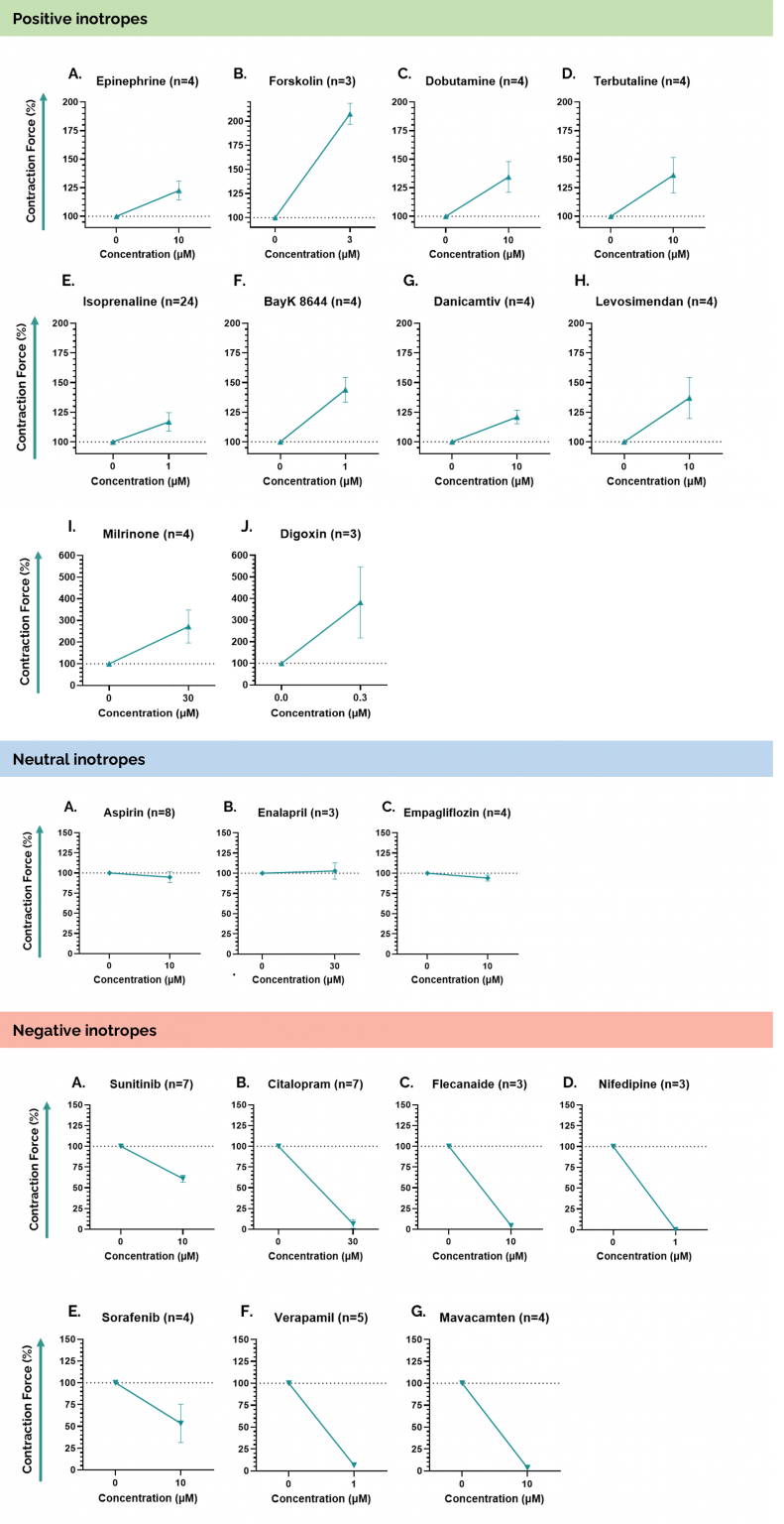 Using the µ-3D Cardiac Strip assay a library of commonly used drugs has been tested on healthy strips.